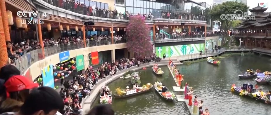南寧民歌湖的民歌廣場是2025年廣西“三月三”的主會場。在水上主舞臺表演的是來自全國各地“四季村歌”歌隊的十幾個代表隊。2025年的廣西“三月三”主會場還有很多有意思的設(shè)置。比如,“有得花”鮮花市集、“有得?!笨萍汲蓖媸屑ⅰ坝械贸浴睎|南亞風(fēng)情水上市集等。