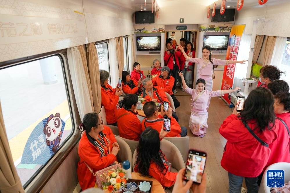 3月28日,在Y471次“熊貓專列·什邡號”列車上,旅客們在觀看云南民族舞蹈表演。