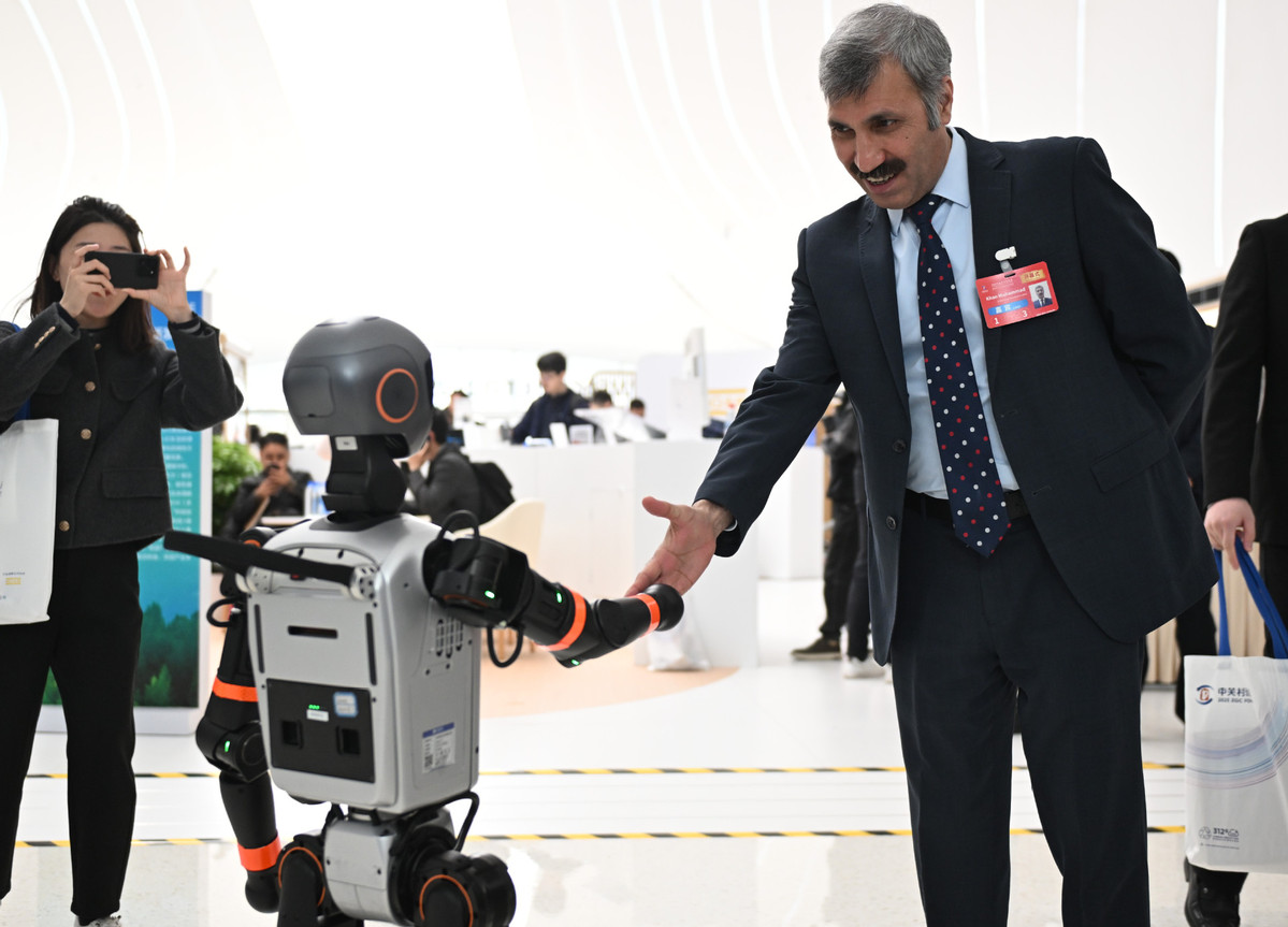 3月27日,與會嘉賓與一款加速T1機(jī)器人握手。(圖片來源:新華社)