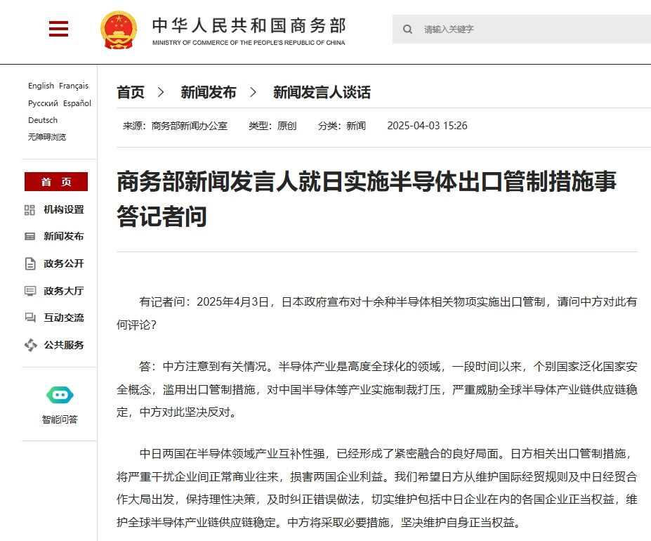 有記者問:2025年4月3日,日本政府宣布對十余種半導(dǎo)體相關(guān)物項(xiàng)實(shí)施出口管制,請問中方對此有何評論?