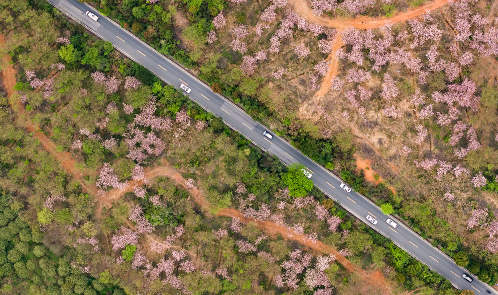游客驅(qū)車前來清鎮(zhèn)市紅楓湖鎮(zhèn)右二村踏青游玩(4月5日攝,無人機照片)。新華社記者 陶亮 攝