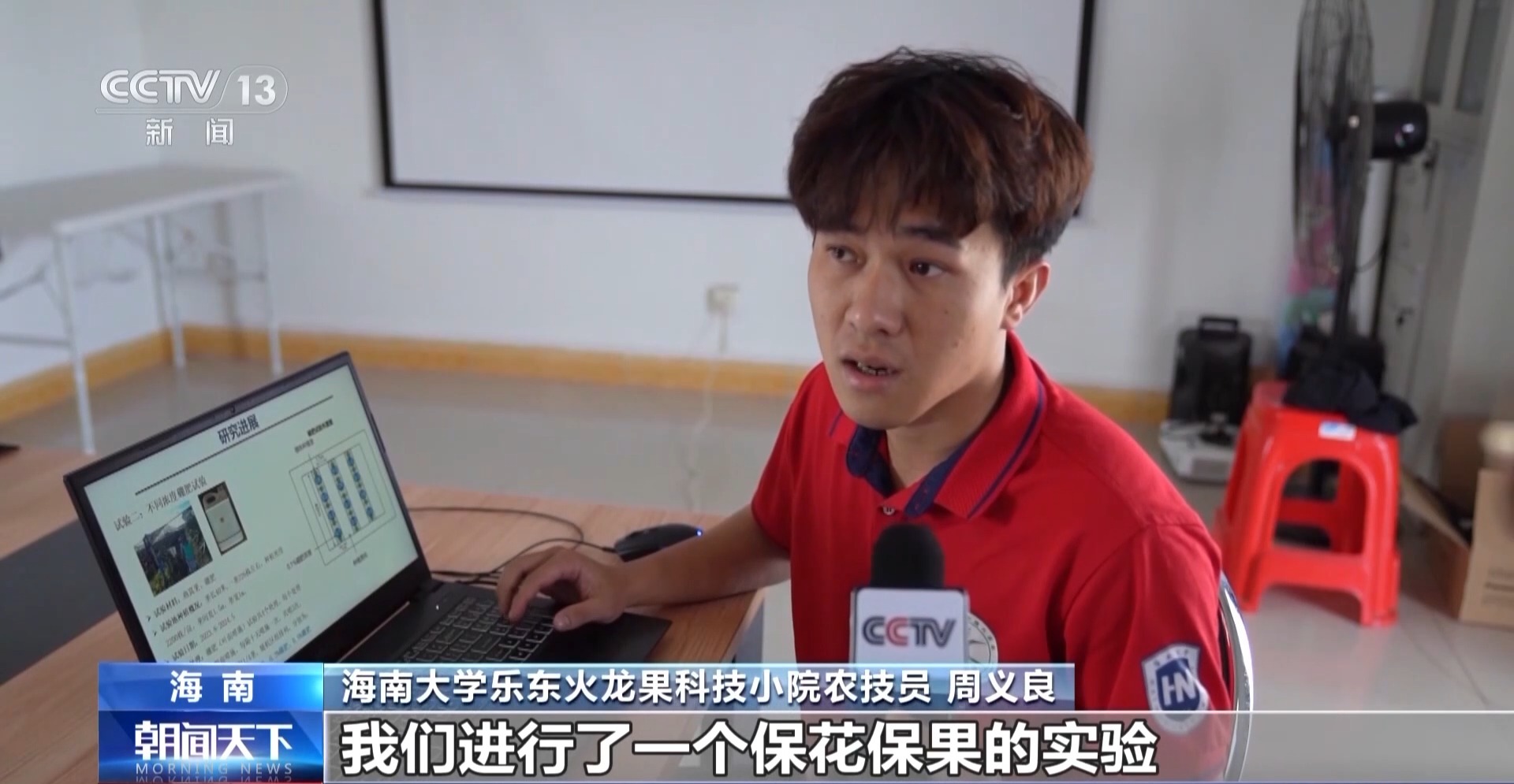 海南大學(xué)樂東火龍果科技小院農(nóng)技員 周義良:根據(jù)這個現(xiàn)狀,我們進(jìn)行了一個?;ū9膶嶒?,通過不同濃度的硼肥、氨基酸肥、授粉和溫度調(diào)控來進(jìn)行實驗,坐果率提升了20%左右。