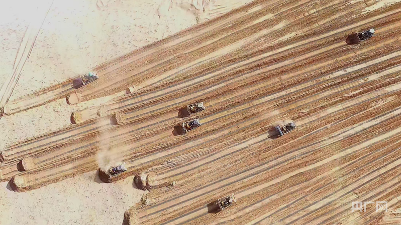 “民豐縣經(jīng)過無數(shù)次試驗(yàn),選擇蘆葦鋪設(shè)草方格沙障,帶動了蘆葦收割產(chǎn)業(yè),參與收割的農(nóng)牧民人均增收7740元左右?!辟Z磊說。