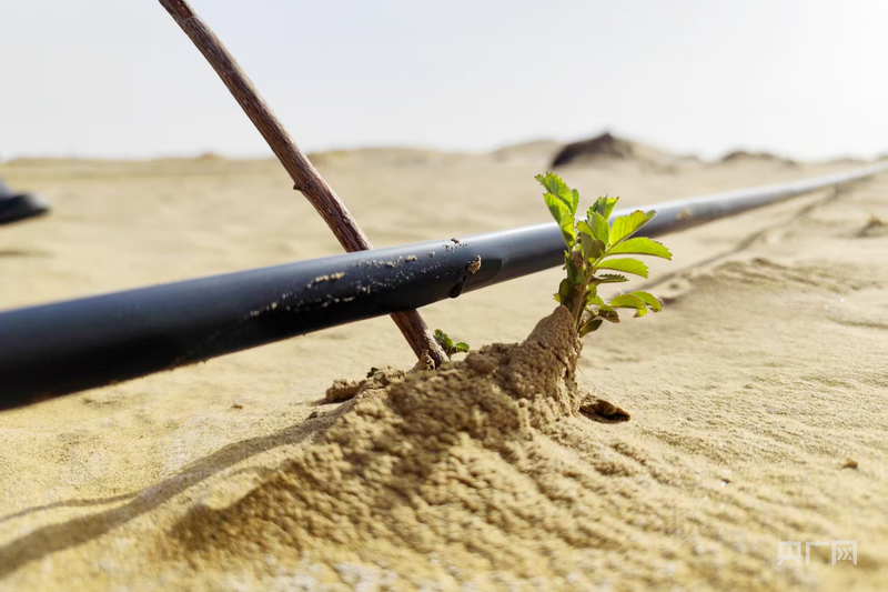 數(shù)臺推土機(jī)以磅礴之勢推平連綿沙丘,為綠色的希望開辟道路;林草技術(shù)中心的技術(shù)人員與護(hù)林員協(xié)作栽種耐旱中草藥苗,每個(gè)動作都飽含著對這片沙地的期待;去年完成塔克拉瑪干鎖邊合龍的區(qū)域,沙漠玫瑰沖破沙層露出新芽;滴灌帶的水滴有序落下,滋潤著這片干涸的沙漠,像一條條生命的脈絡(luò)延伸在廣袤沙?!?/p>