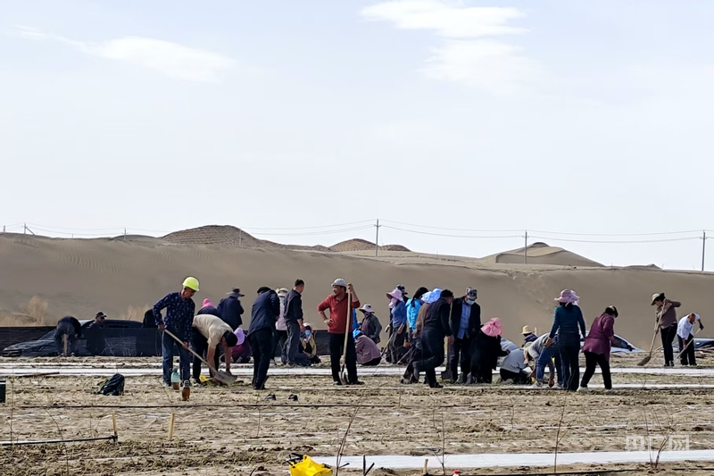 在民豐縣防沙治沙試驗(yàn)站,林草技術(shù)中心的技術(shù)人員與護(hù)林員協(xié)作栽種耐旱中草藥苗 (央廣網(wǎng)發(fā) 馬曉杉 攝)