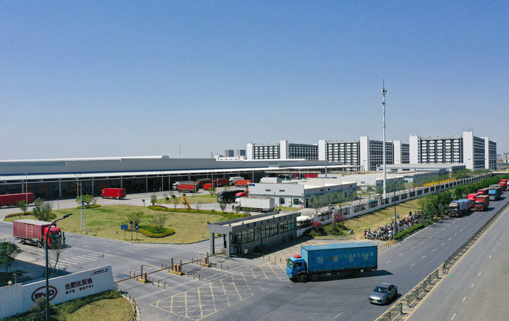 春風(fēng)和煦,楊柳輕舞,從合肥市區(qū)驅(qū)車(chē)向北約35公里,行至長(zhǎng)豐縣中南部的下塘鎮(zhèn),以比亞迪命名的主干道上,運(yùn)送汽車(chē)零部件的貨車(chē)排成長(zhǎng)長(zhǎng)一列,魚(yú)貫而入比亞迪合肥基地園區(qū)。