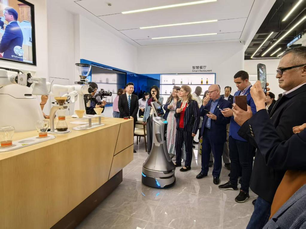 4月15日,駐華使節(jié)在九江機(jī)器人小鎮(zhèn)觀看機(jī)器咖啡師現(xiàn)場制作咖啡。新華社記者 成欣 攝