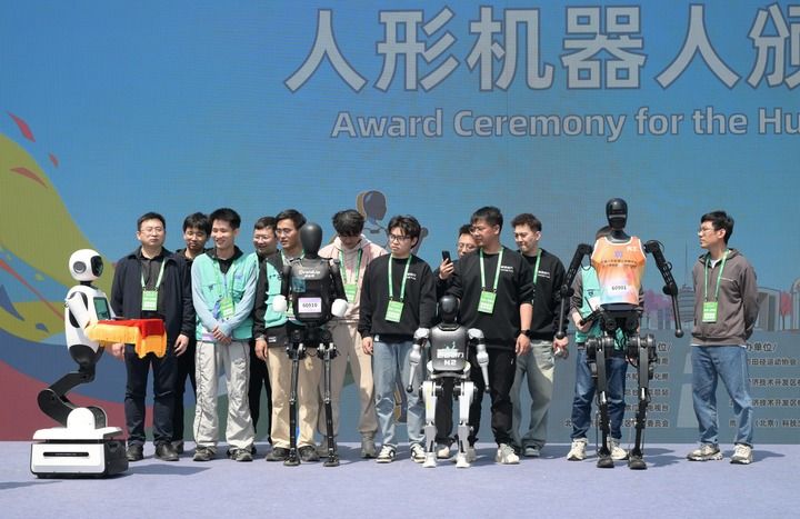2025年4月19日,一臺機(jī)器人在人形機(jī)器人頒獎儀式上托舉著獎牌走向獲獎機(jī)器人選手和技術(shù)團(tuán)隊(duì)。當(dāng)日,2025北京亦莊半程馬拉松暨人形機(jī)器人半程馬拉松舉行。新華社記者 李賀 攝