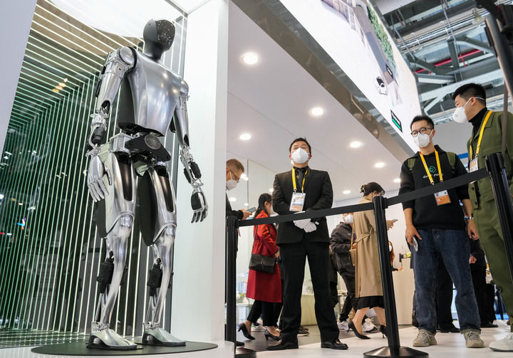 2022年11月5日,在第五屆進(jìn)博會汽車展區(qū)拍攝的特斯拉人形機(jī)器人。新華社記者 丁汀 攝