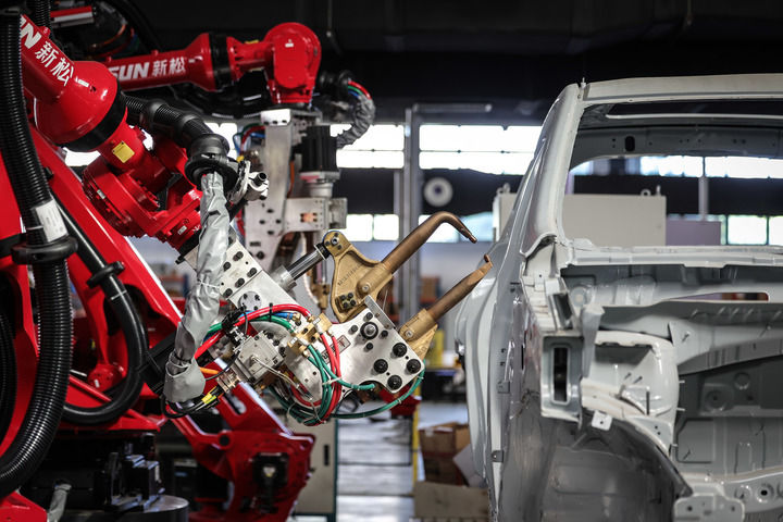 2024年6月3日拍攝的點(diǎn)焊機(jī)器人。機(jī)器人被廣泛應(yīng)用于工業(yè),它們能夠勝任繁重、危險或復(fù)雜的工作,提高生產(chǎn)效率和經(jīng)濟(jì)效益。新華社記者 潘昱龍 攝