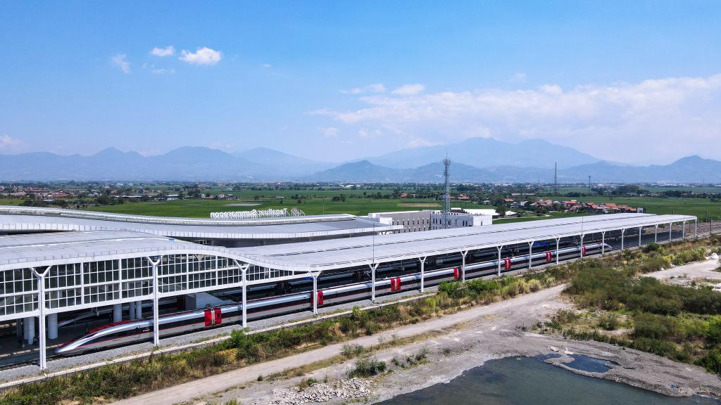 圖為2024年9月13日在印度尼西亞萬(wàn)隆德卡魯爾站拍攝的停靠在站臺(tái)上的雅萬(wàn)高鐵高速動(dòng)車組(無(wú)人機(jī)照片)。新華社記者徐欽攝
