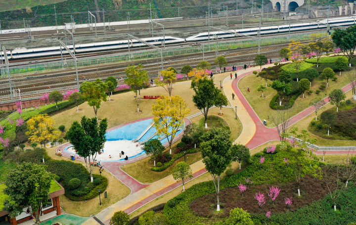 陽(yáng)春三月、百花爭(zhēng)艷,兩江新區(qū)木桃路社區(qū)公園因靠近鐵路,形成了“開往春天的列車”的獨(dú)特景觀,引來(lái)不少市民拍照?!斑^(guò)去這里是個(gè)建筑棄渣場(chǎng),社區(qū)周邊沒(méi)有休閑的地方。經(jīng)改造變成了高低錯(cuò)落的山地公園,兒童樂(lè)園、健身步道、飲水等設(shè)施都有,我們現(xiàn)在散步健身有了好地方。”住在附近的鄒女士滿意地說(shuō)。