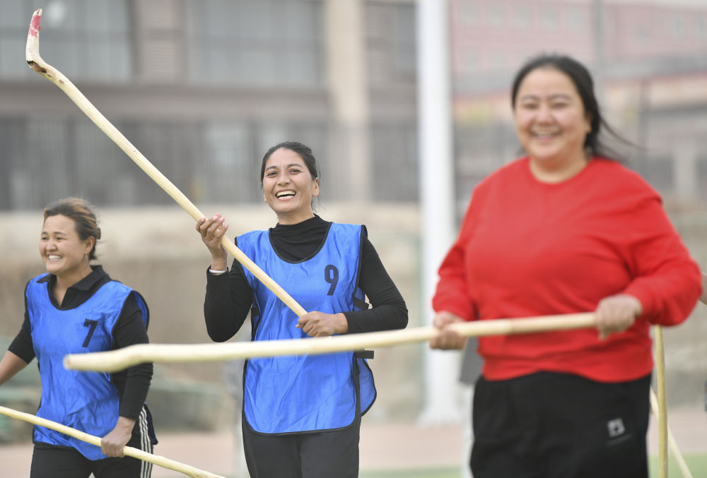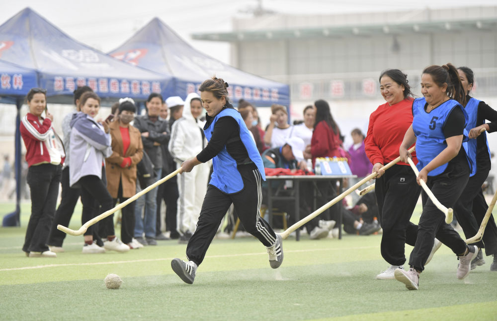39歲的阿依古麗·買托合提是球隊(duì)里最年長(zhǎng)的隊(duì)員。她身穿皮衣、腳踏休閑鞋,奔跑在正午驕陽(yáng)下,屢屢揮動(dòng)球桿,拼搶也毫不遜色。一起訓(xùn)練的隊(duì)友有人穿著牛仔褲,有人穿著襯衫,還有人穿著后跟略高的鞋子。紅色的球洞穿由兩個(gè)塑料水瓶組成的球門(mén),得分的一方歡呼不已,失球的隊(duì)員則懊惱地擦去臉上的沙塵。