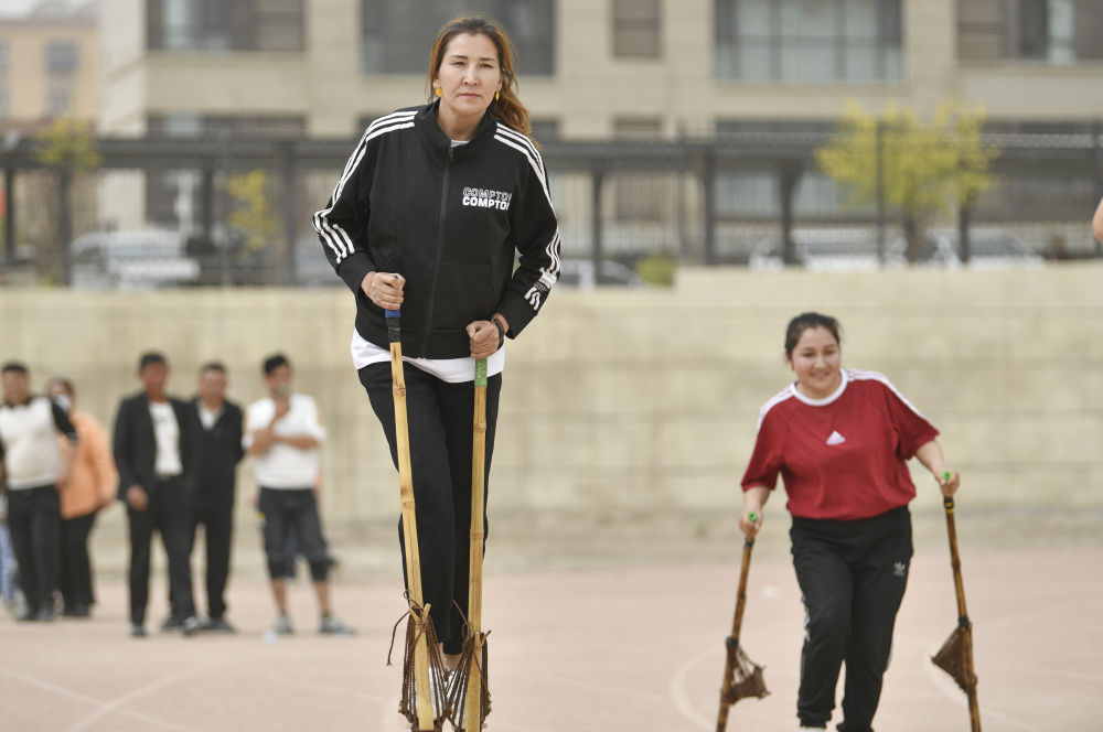 運(yùn)動(dòng)場上,柔鮮古麗一改治沙時(shí)的“防守”姿態(tài),勇往直前。為期三天的比賽中,場邊觀戰(zhàn)的女兒一邊隨她奔跑,一邊賣力地為母親加油助威,柔鮮古麗拿下了100米和200米的全縣高腳競速比賽冠軍。