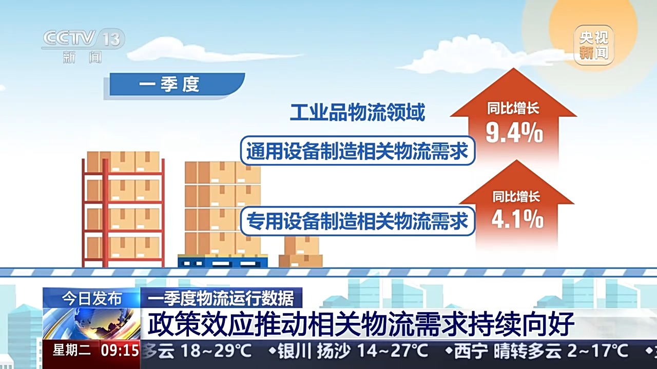 政策效應持續(xù)顯現,大規(guī)模設備更新、消費品以舊換新政策推動相關物流需求持續(xù)向好。一季度,工業(yè)品物流領域的通用設備、專用設備制造相關物流需求,同比分別增長9.4%、4.1%;民生消費領域的通信器材類、家用電器和音像器材類、家具類商品零售相關物流需求同比分別增長26.9%、19.3%和18.1%。