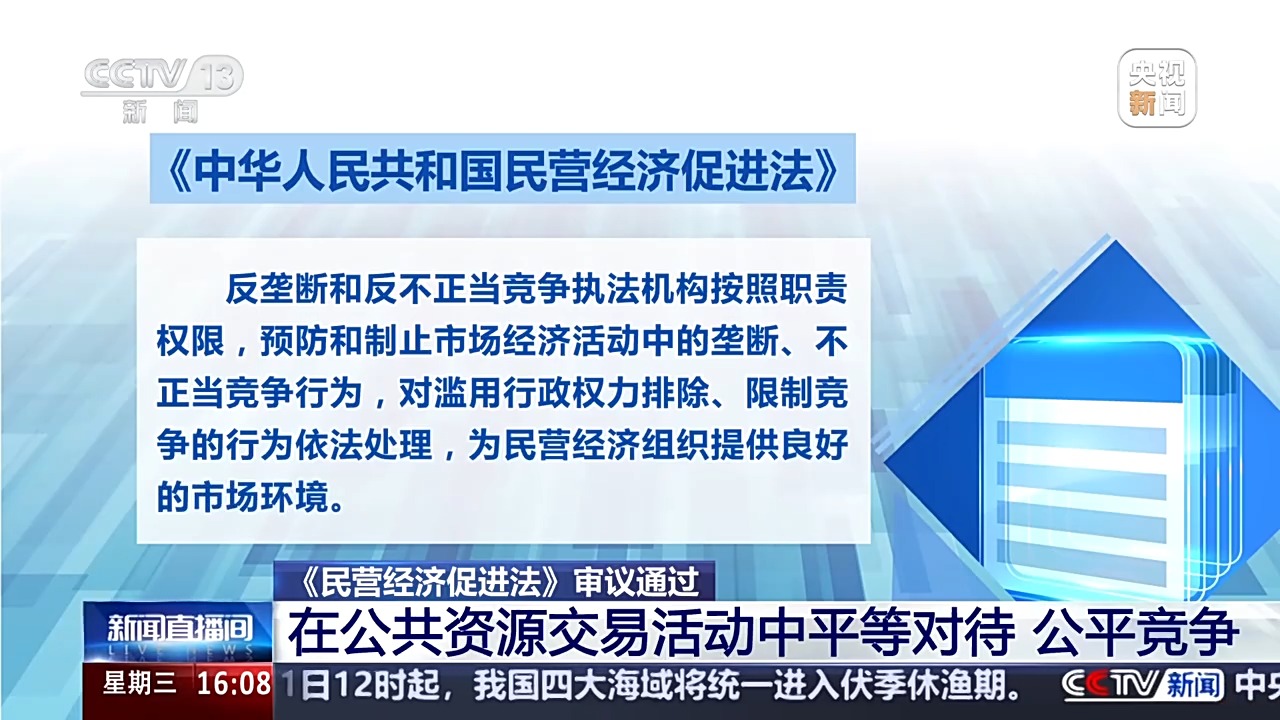 據(jù)楊合慶介紹,民營經(jīng)濟促進法在保障公平競爭方面,完善了民營經(jīng)濟組織市場準入領(lǐng)域公平參與市場競爭的制度機制,把實踐中行之有效的政策和做法確定為法律制度。