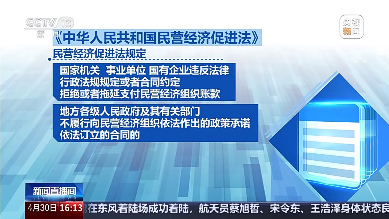 另外,民營經(jīng)濟促進法規(guī)定,國家機關(guān)、事業(yè)單位、國有企業(yè)違反法律、行政法規(guī)規(guī)定或者合同約定,拒絕或者拖延支付民營經(jīng)濟組織賬款,地方各級人民政府及其有關(guān)部門不履行向民營經(jīng)濟組織依法作出的政策承諾、依法訂立的合同的,由有權(quán)機關(guān)予以糾正,造成損失的,依法予以賠償;造成不良后果或者影響的,對負有責任的領(lǐng)導人員和直接責任人員依法給予處分。