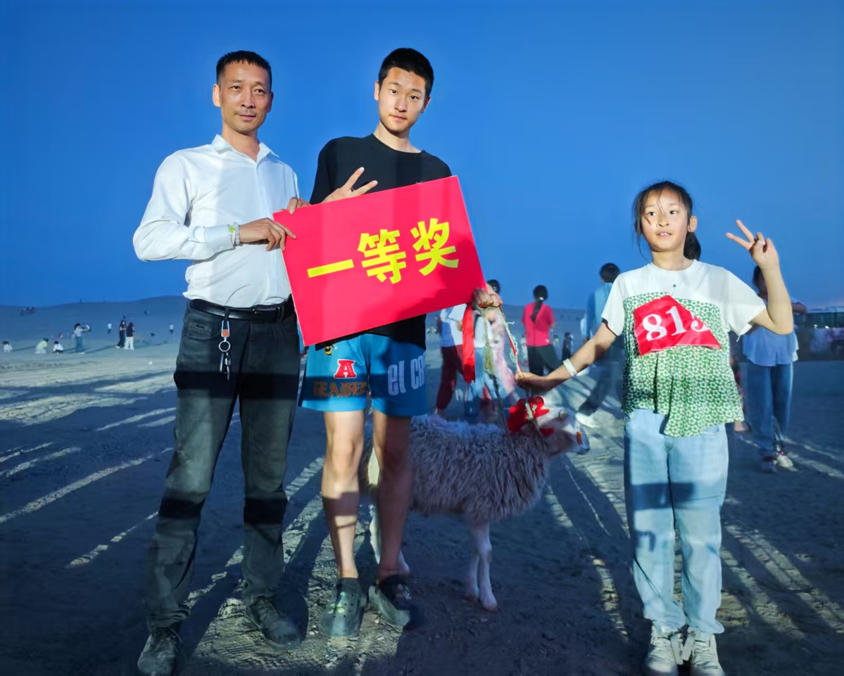 這是5月1日洛浦縣玉龍灣沙漠樂園“大手拉小手”親子徒步比賽家庭組一等獎獲得者哥哥李一銘與妹妹李鈺瑩在領(lǐng)取獎品一只羊后與父親的合照。
