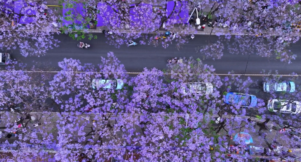“五一”假期,昆明市教場(chǎng)中路延綿的紫色花海盛開(kāi)。