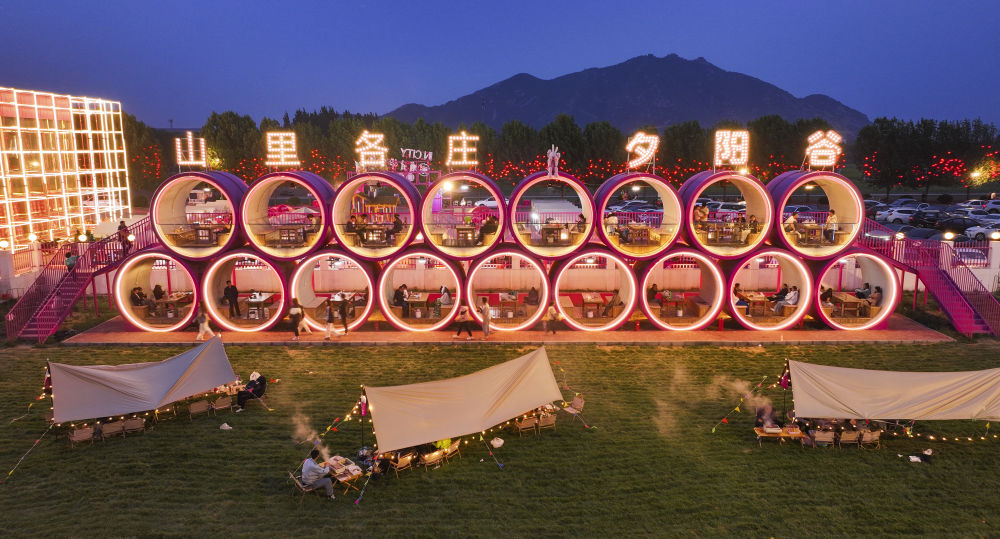 5月5日,游客在河北省遵化市夕陽谷景區(qū)游玩時(shí)品嘗美食(無人機(jī)照片)。