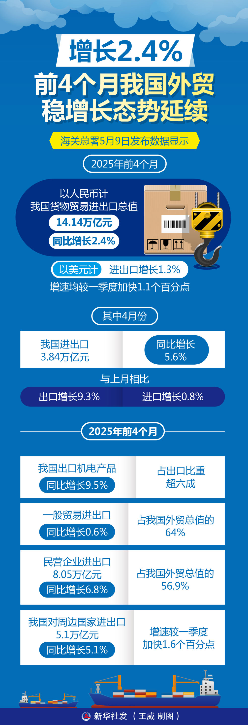 海關(guān)總署5月9日發(fā)布數(shù)據(jù)顯示,2025年前4個月,以人民幣計,我國貨物貿(mào)易進出口總值14.14萬億元,同比增長2.4%,以美元計,進出口增長1.3%,增速均較一季度加快1.1個百分點。其中4月份,我國進出口3.84萬億元,同比增長5.6%。與上月相比,雖出口同比增速高位小幅回落至9.3%,但進口由降轉(zhuǎn)為增長0.8%。