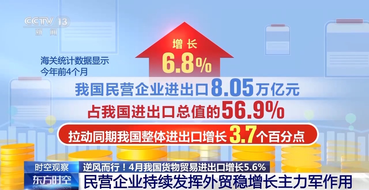 海關(guān)總署統(tǒng)計分析司司長 呂大良:今年以來,各項促進民營經(jīng)濟發(fā)展的政策措施協(xié)同發(fā)力,參與外貿(mào)的民營企業(yè)數(shù)量穩(wěn)定增加。前4個月,有進出口實績的民營企業(yè)達49.2萬家,增加8.2%,占我國有進出口實際企業(yè)數(shù)量的86.5%。