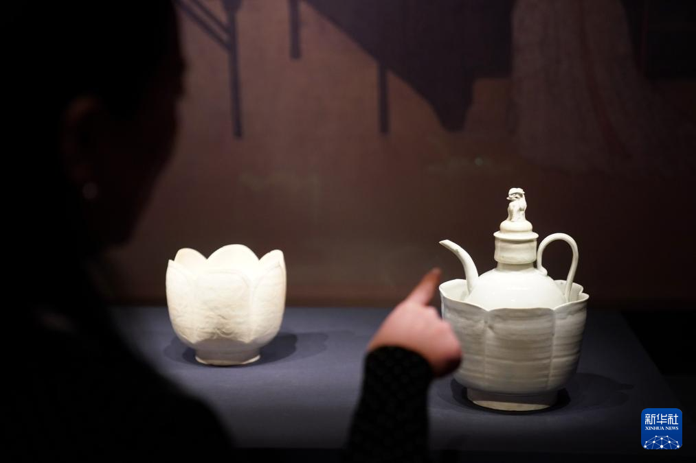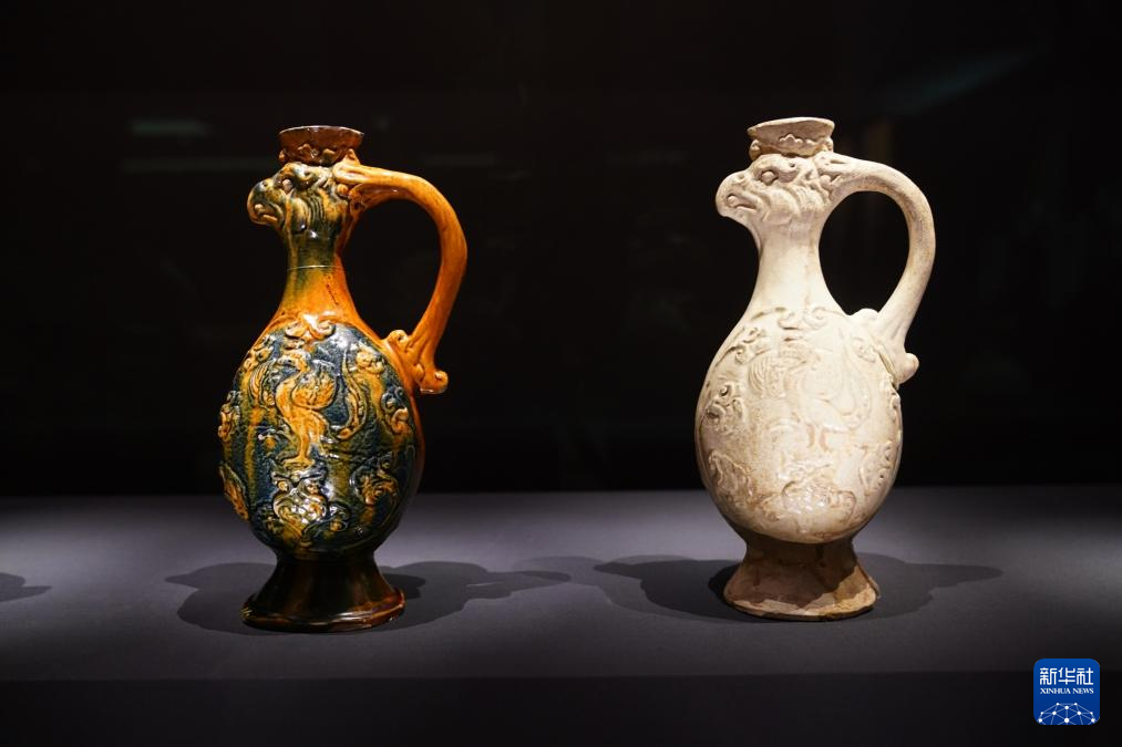 繼續(xù)前行,便來到“跨越文化——胡食風尚”單元。故宮博物院藏唐代鳳首壺與舊金山亞洲藝術(shù)博物館藏鳳首壺“并肩而立”,它們獨特的把手與流口設(shè)計,仿佛訴說著胡人傾注式倒酒習俗對中原的影響。