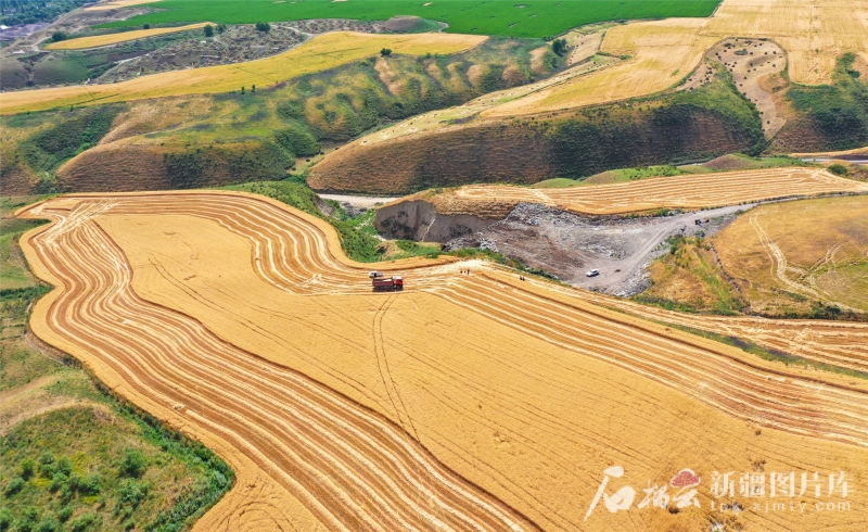 2024年6月24日,在新源縣則克臺(tái)鎮(zhèn)則克臺(tái)村的麥田里,隨著大型收割機(jī)駛過,麥穗、秸稈有序分離,一顆顆麥粒從收割機(jī)出料口傾瀉而下,裝進(jìn)運(yùn)糧車?yán)?。張文庭攝