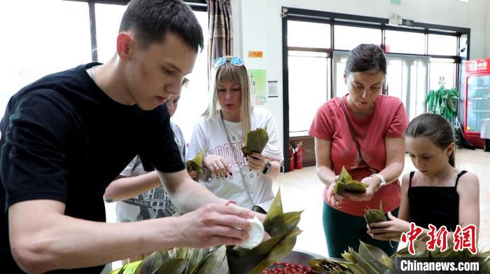 俄羅斯游客在雙鴨山市饒河縣學習包粽子?!○埡涌h融媒體中心供圖