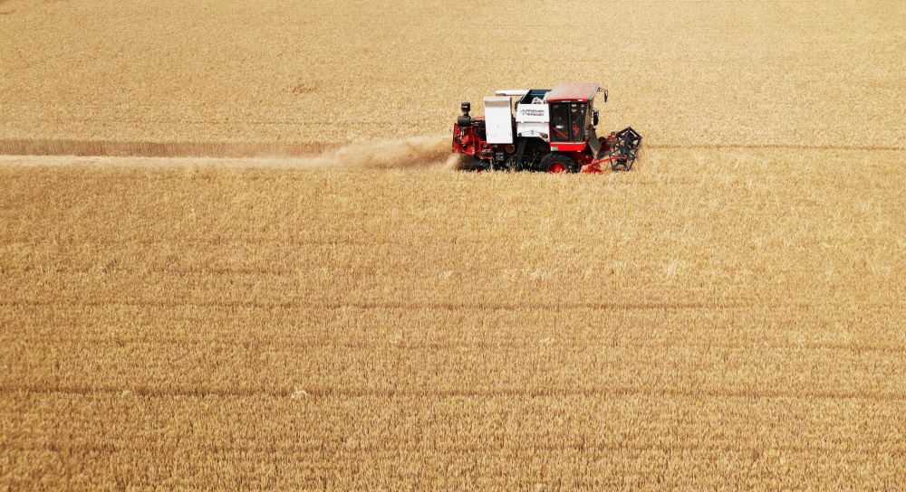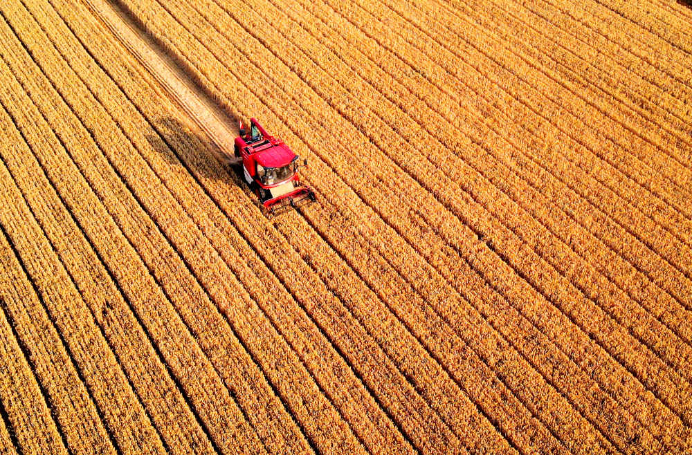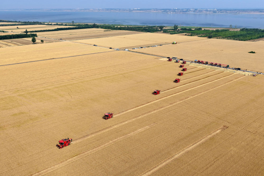 麥田金黃,農機手收割正酣,一排排小麥被整齊地切割、脫粒……廣袤農田一片繁忙景象。