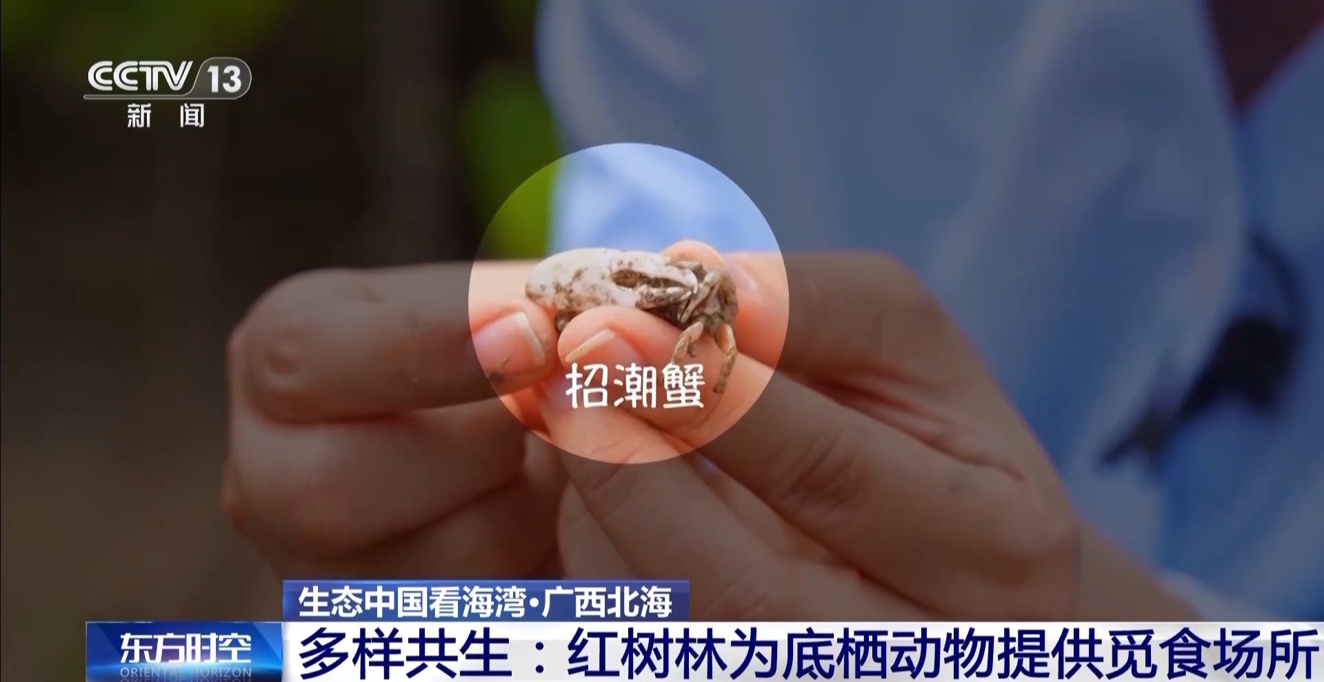 總臺記者 王潔:我手上就有兩只非常可愛的蟹類,非常小巧玲瓏,很可愛活潑,叫擬相手蟹,喜歡爬樹?;野咨氖谴菩?,雄蟹則是個更大而且全身通紅,更加威風(fēng)凜凜,它們叫“招潮蟹”。