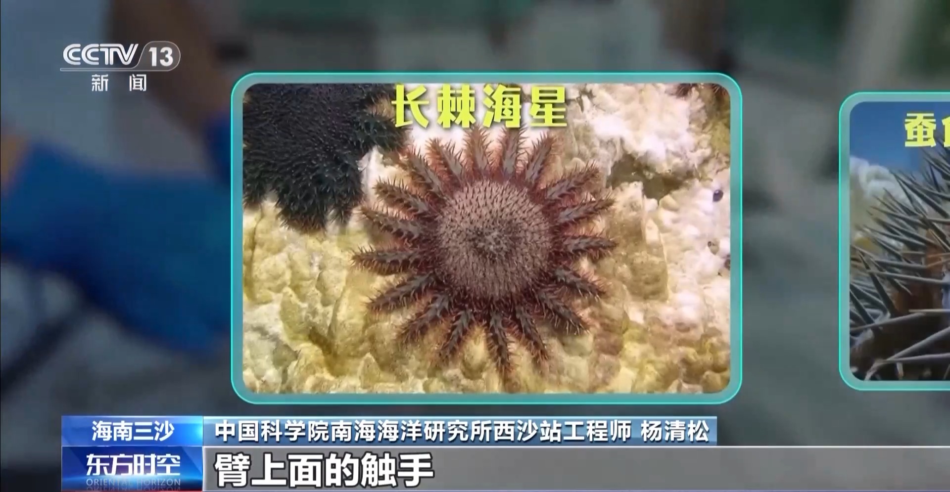 中國科學(xué)院南海海洋研究所西沙站工程師 楊清松:這個海星有十幾只臂,臂上面的觸手,它會伸出來,它把它的胃整個排出來,把珊瑚包裹住,把整個珊瑚的組織給消化掉,只剩骨骼了,這個跟珊瑚白化不一樣,吃掉就沒辦法了。