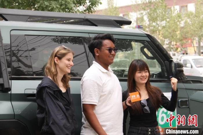 北京語言大學的留學生們在環(huán)塔拉力賽事期間體驗中國新能源車。賈志鵬 攝