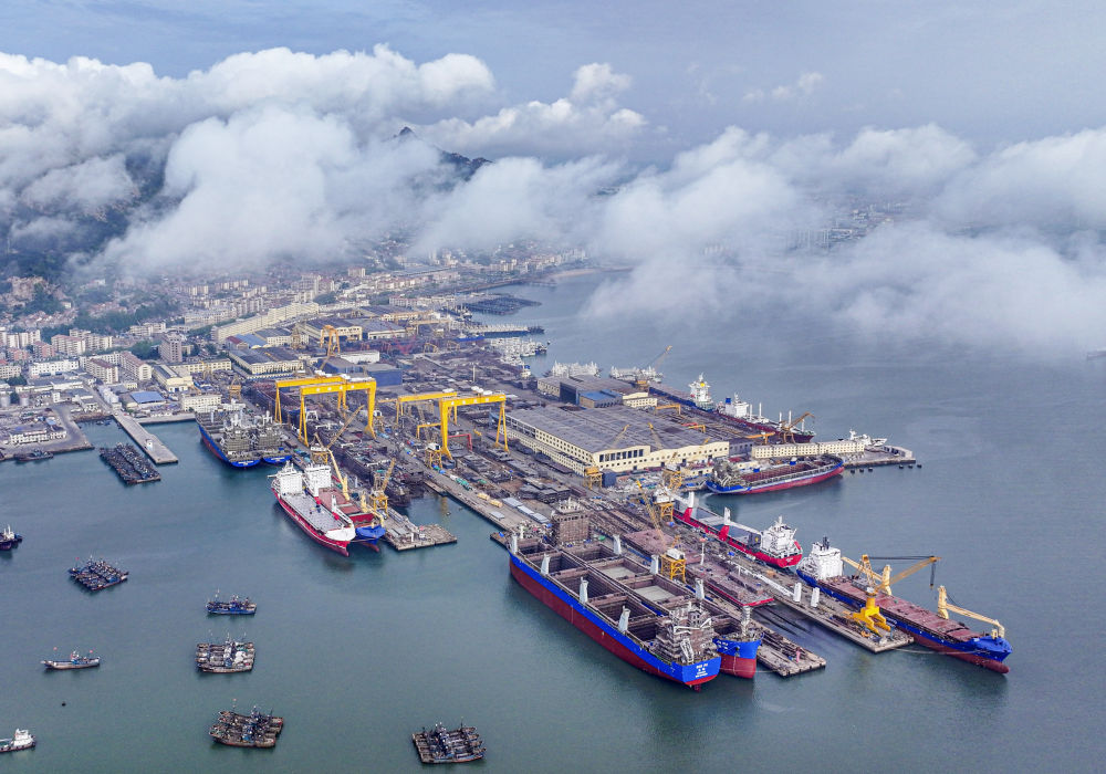 5月8日拍攝的山東省榮成市石島管理區(qū)修造船產(chǎn)業(yè)基地船塢(無人機(jī)照片)。新華社發(fā)(李信君攝)