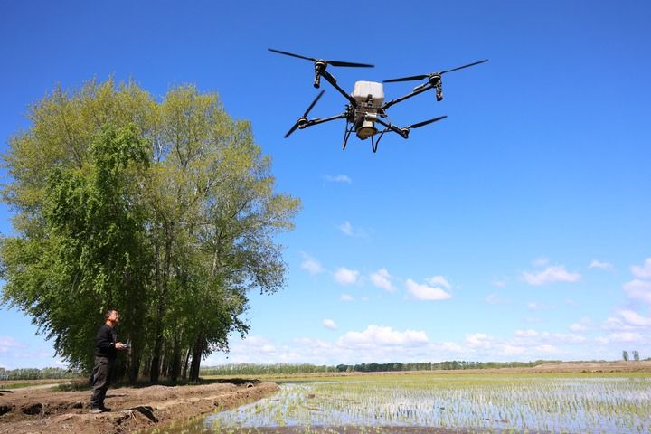 2025年5月21日,在北大荒集團黑龍江綏濱農(nóng)場有限公司東井管理區(qū),操作員操控搭載北斗導(dǎo)航系統(tǒng)的植保無人機,對即將施返青肥的地塊進行打點。新華社發(fā)(李興攝)