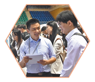 中國人民大學(xué)經(jīng)管專場雙選會(huì)現(xiàn)場,合作企業(yè)工作人員(左)與求職同學(xué)交流。 中國人民大學(xué)供圖
