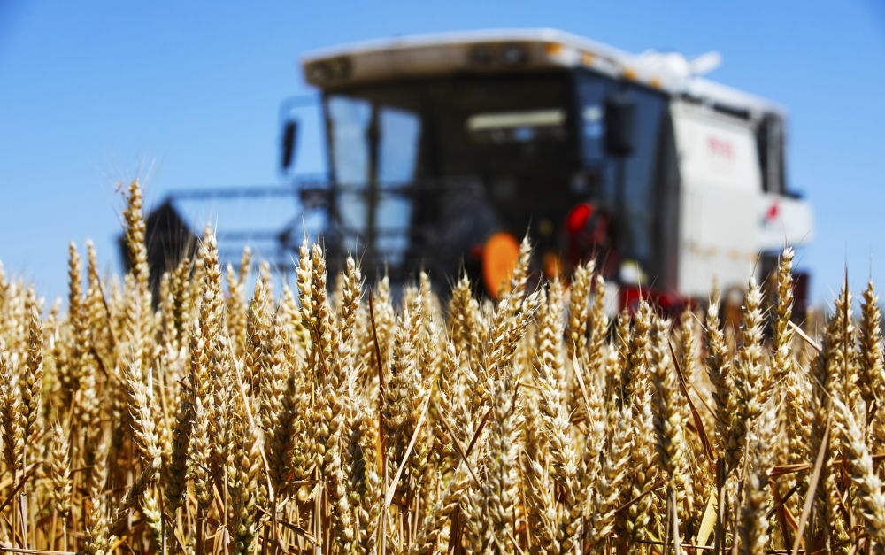 6月4日,在山東省東營市廣饒縣李鵲鎮(zhèn)皮里村的麥田里,農(nóng)民駕駛收割機收割小麥。新華社發(fā)(劉云杰攝)