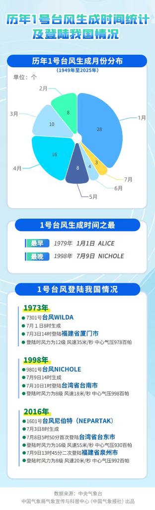 氣象上通常將當(dāng)年西北太平洋及南海生成的首個(gè)編號(hào)臺(tái)風(fēng)稱為“初臺(tái)”。統(tǒng)計(jì)顯示,每年1號(hào)臺(tái)風(fēng)生成的時(shí)間分散在1月至7月。1979年的“初臺(tái)”在元旦當(dāng)天就生成了,而1998年的“初臺(tái)”則直到7月9日才出現(xiàn)。常年平均“初臺(tái)”生成時(shí)間為3月25日,從這個(gè)角度看,今年第一個(gè)臺(tái)風(fēng)有點(diǎn)姍姍來(lái)遲了。