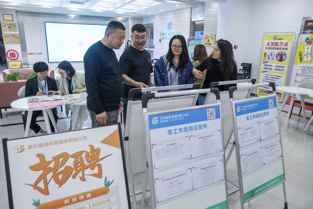 5月8日,在浙江省嘉興市南湖區(qū)零工市場的一場零工招聘會上,求職者查看各類崗位。新華社記者 徐昱 攝