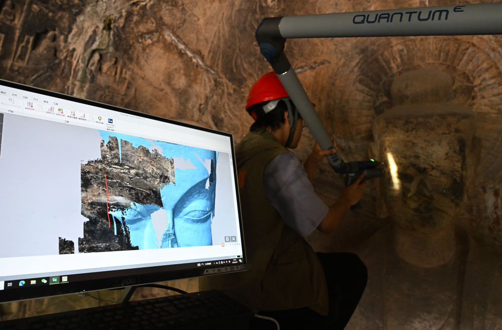4月9日,武漢大學文化遺產智能計算實驗室團隊成員在龍門石窟魏字洞使用關節(jié)臂掃描儀對佛像進行數字化掃描。新華社記者 李嘉南 攝