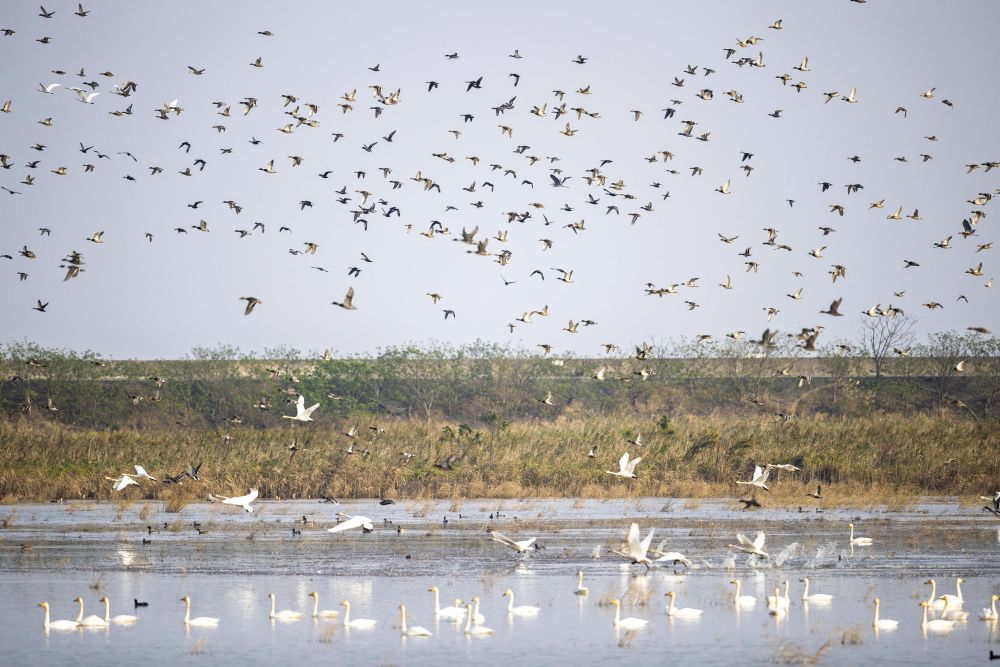長江入???,上海崇明東灘候鳥棲息地淺灘與潮溝相間,水鳥悠然棲息于草叢之間。作為“中國黃(渤)海候鳥棲息地(第二期)”的遺產地之一,每年有大量鳥類在這里過境、停留。