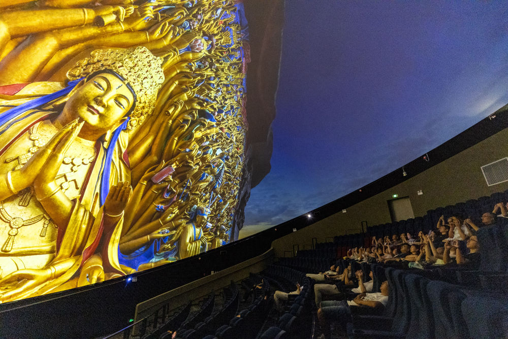 2024年9月27日,游客在重慶大足石刻景區(qū)觀看8K數字球幕影片《大足石刻》。新華社記者 黃偉 攝