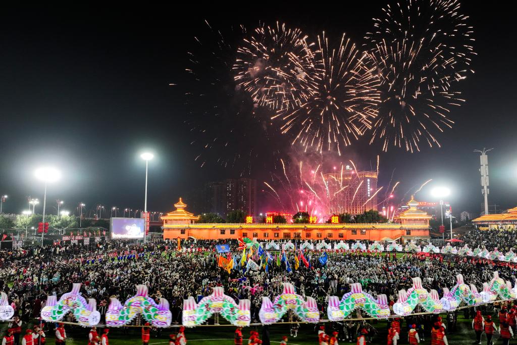 2025年1月4日,人們?cè)谫F州榕江縣舉辦的“村超村晚”活動(dòng)中表演非遺節(jié)目“多耶”(無(wú)人機(jī)照片)。新華社記者 楊文斌 攝