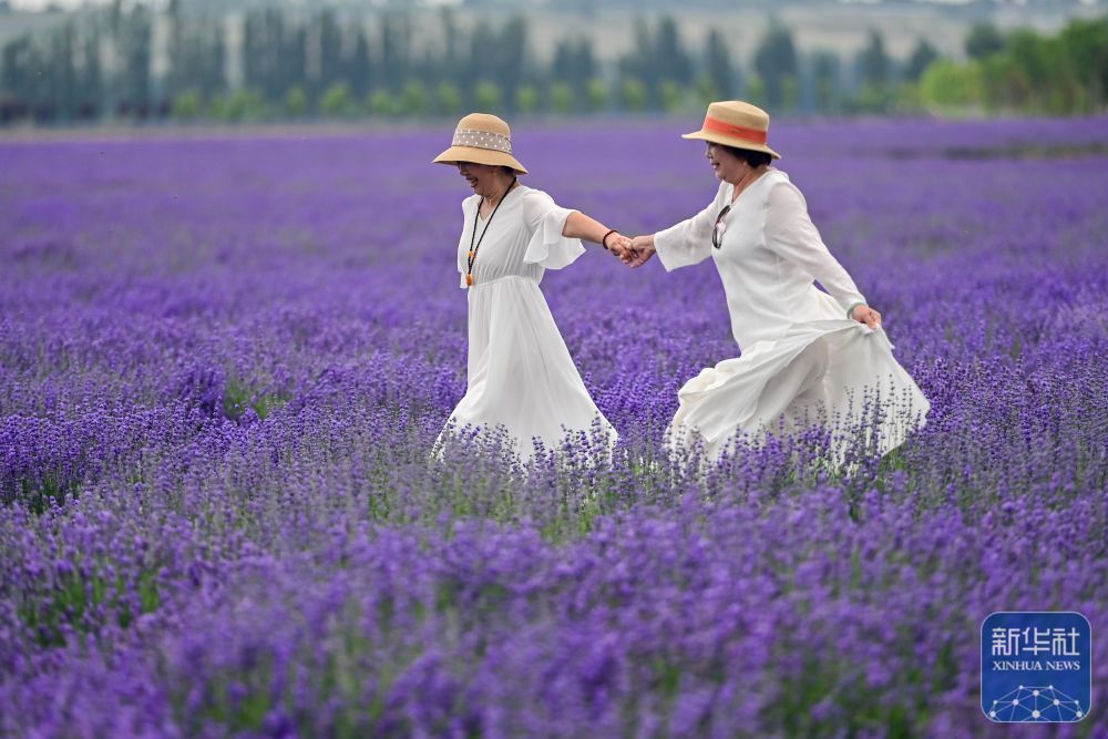 游客在新疆伊犁哈薩克自治州霍城縣解憂公主薰衣草農(nóng)場游玩(6月14日攝)。