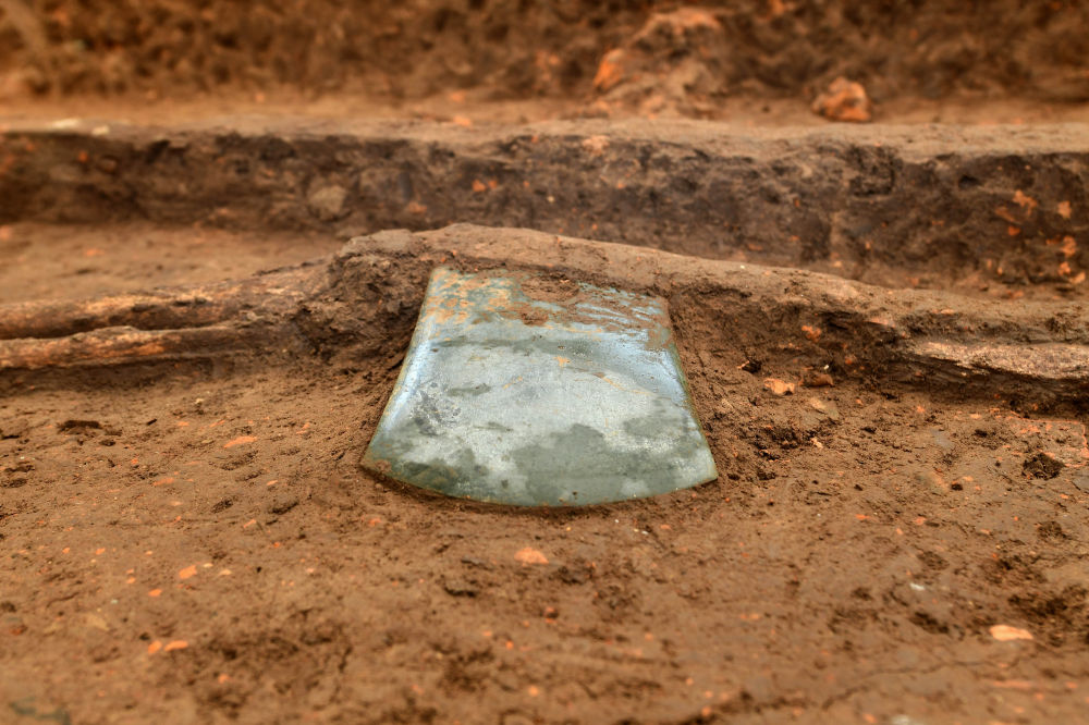 這是2022年12月10日在河南南陽黃山遺址拍攝的屈家?guī)X文化高級別大型墓葬中隨葬的玉鉞。新華社發(fā)(陳輝 攝)