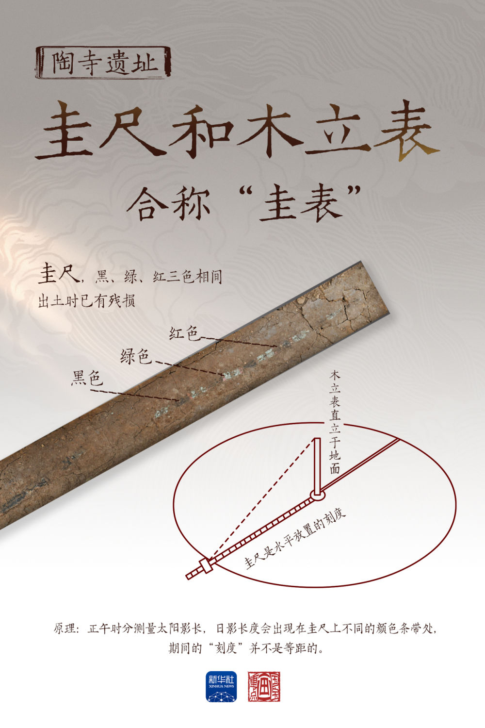 圭尺和木立表,是陶寺遺址出土的另外一件觀天象、授人時的文物,合稱“圭表”。木立表直立于地面,圭尺是水平放置的刻度。圭表測量太陽影長,與觀象臺相輔相成,用于太陽歷法的制定。黑、綠、紅三色相間的漆木桿“圭尺”,出土?xí)r已有殘損,殘長171.8厘米,復(fù)原長度187.5厘米。正午時刻,太陽照在木立表上,投下的影子被圭尺上的刻度標(biāo)記出長短。在夏至、春分和秋分,日影長度會出現(xiàn)在圭尺上不同的顏色條帶處,期間的“刻度”并不是等距的。