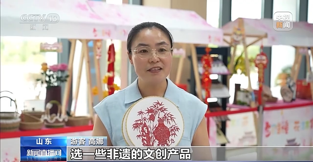 游客 高娜:經(jīng)常跟朋友們來這里逛一逛,選一些非遺的文創(chuàng)產(chǎn)品,今天選了幾把這個(gè)剪紙的折扇,特別喜歡。