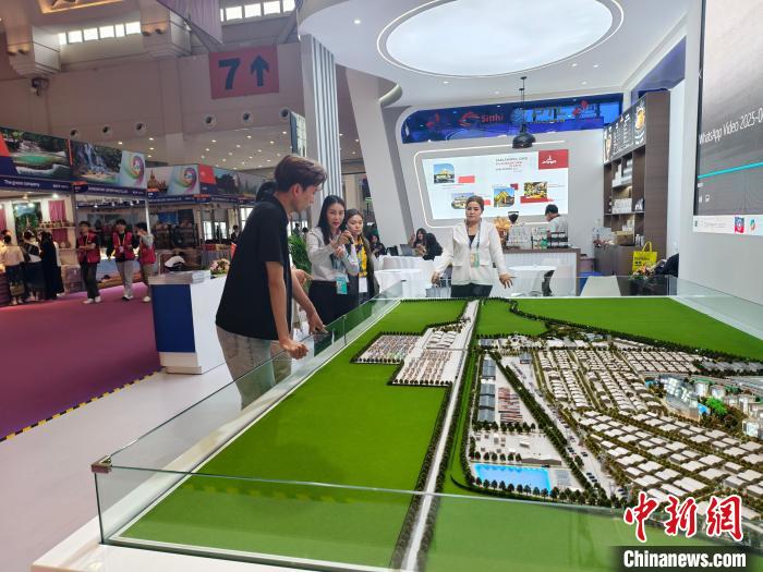 6月20日,第9屆南博會(huì)萬(wàn)象物流園展位工作人員為參觀(guān)者介紹園區(qū)情況。 中新社記者 韓帥南 攝