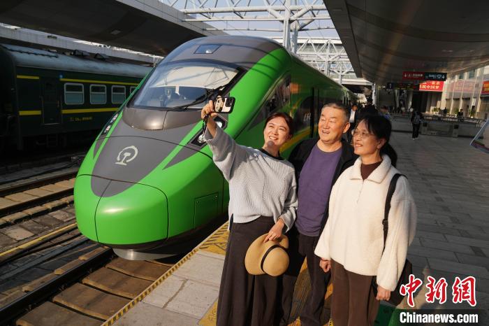 3月28日,中老鐵路第5000萬(wàn)名旅客孫怡薇一家在列車(chē)前合影。中新社記者 劉冉陽(yáng) 攝