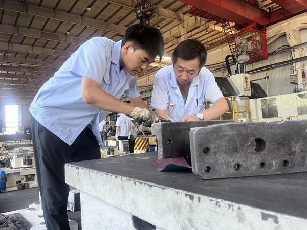 黨金鑫(左一)與師傅正在對(duì)汽車裝備廠模具進(jìn)行修復(fù)。受訪者供圖